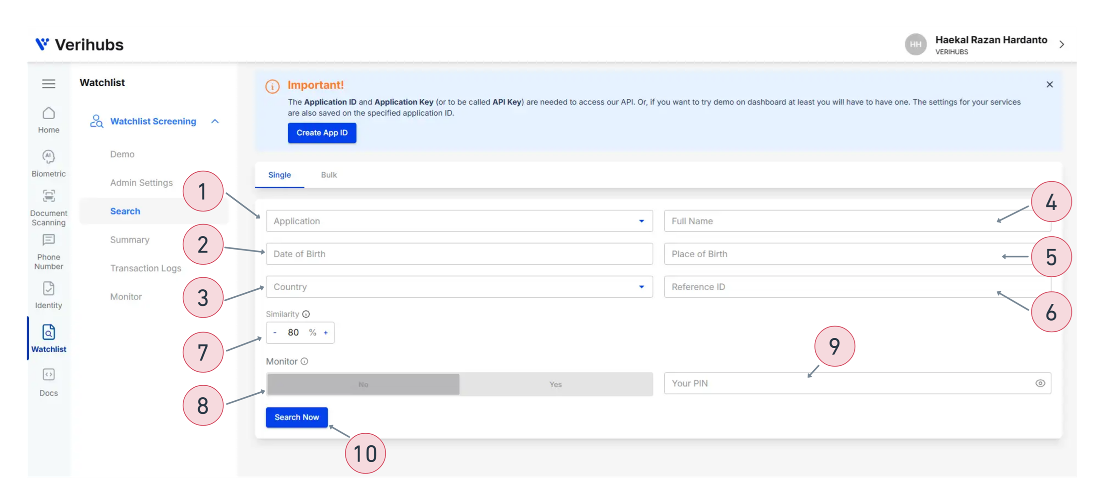 8 | Monitor | Option to turn on monitor for the selected profile results. This monitoring feature should be under an agreement only. You cannot access the monitor if you are not subscribing to Watchlist Screening Service. |
